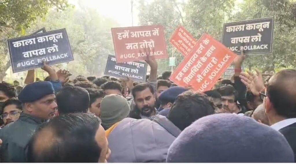 वाराणसी (जनवार्ता)। काशी हिंदू विश्वविद्यालय (बीएचयू) में गुरुवार को यूजीसी की नई ‘उच्च शिक्षा संस्थानों में समता संवर्धन नियमावली, 2026′ के खिलाफ छात्रों ने भारी विरोध प्रदर्शन किया। विश्वनाथ मंदिर से शुरू हुआ यह विशाल जुलूस बीएचयू मुख्य द्वार तक पहुंचा, जहां यूजीसी काला कानून वापस लो’, ‘यूजीसी रोल बैक’ और ‘समानता की आड़ में भेदभाव’ जैसे नारे गूंजते रहे। छात्रों ने इन नियमों को शिक्षा की स्वतंत्रता और समानता के खिलाफ भेदभावपूर्ण बताते हुए पूर्ण वापसी की मांग की। हजारों छात्रों ने प्लेकार्ड और बैनर लहराते हुए कहा कि ये नियम सामान्य वर्ग के छात्रों की स्वतंत्रता छीनेंगे, कैंपस में दोस्ती-रिश्तों में जाति का हस्तक्षेप बढ़ाएंगे और झूठी शिकायतों से उत्पीड़न का खतरा पैदा करेंगे। एक छात्र ने कहा कि ये नियम एससी/एसटी/ओबीसी की सुरक्षा के नाम पर सामान्य छात्रों को दोयम दर्जे का बना देंगे, जिससे शिक्षा में असमानता बढ़ेगी, न कि कम होगी। विरोध के दौरान कुछ छात्रों ने यूजीसी अधिसूचना की प्रतियां भी जलाईं।