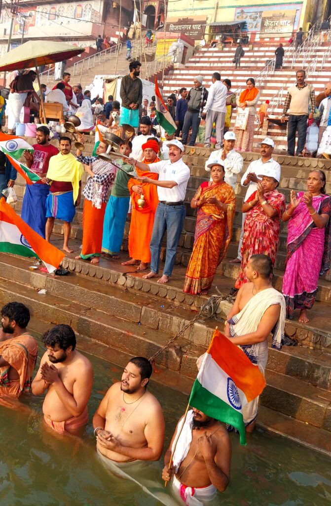 आरोग्य भारत की कामना से सभी ने एक स्वर में द्वादश ज्योतिर्लिंग स्तोत्र और गंगाष्टकम का सामूहिक पाठ किया। राष्ट्रध्वज हाथों में थामे सभी ने गंगा स्वच्छता और पर्यावरण संरक्षण का संकल्प भी लिया।