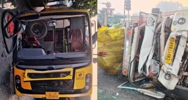 रिंग रोड चौराहे पर स्कूली बस और पिकअप की आमने-सामने भिड़ंत