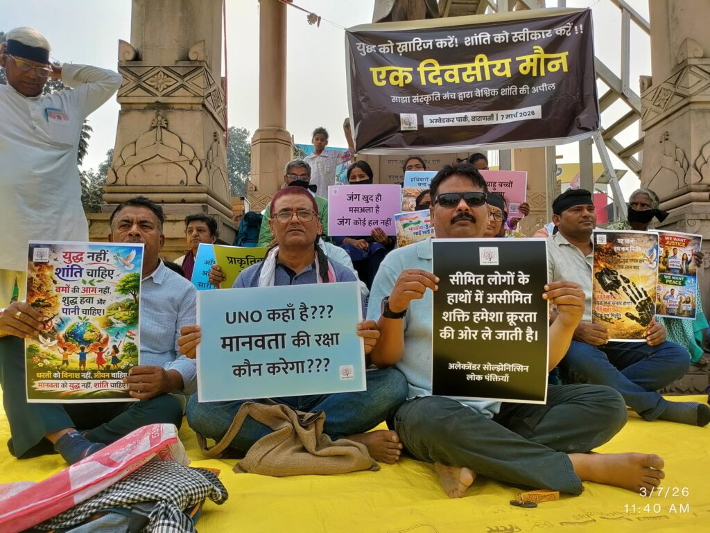 वाराणसी (जनवार्ता)। ईरान पर अमेरिका और इज़राइल द्वारा की गई सैन्य कार्रवाई के विरोध में साझा संस्कृति मंच, वाराणसी के आह्वान पर रविवार को अम्बेडकर पार्क, कचहरी में एक दिवसीय मौन उपवास और धरना आयोजित किया गया। कार्यक्रम सुबह 10 बजे से दोपहर 3 बजे तक चला, जिसमें शहर के विभिन्न सामाजिक-सांस्कृतिक संगठनों, नागरिकों और गणमान्यों ने बड़ी संख्या में भाग लिया।